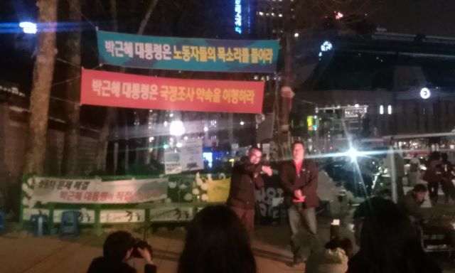 추모가 연행의 사유여야 하나? 어이없던 오늘 오전의 연행에서 석방된 #쌍차 김정우 지부장과 고동민 동지가 석방되어, 대한문 문화제에 함께합니다. http://t.co/wjLgfGYwkl