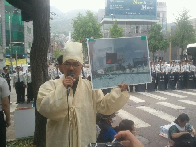 이명박 대통령 면담요구를 막는 경찰들 때문에 청운동에서 연좌중입니다. 김정우 지부장님이 2009년 #쌍차 진압사진을 들고 발언하십니다. 끔찍했던 해고의 기억, 결국 상복을 입고 이자리에 선 노동자들을 지켜줍시다! http://t
